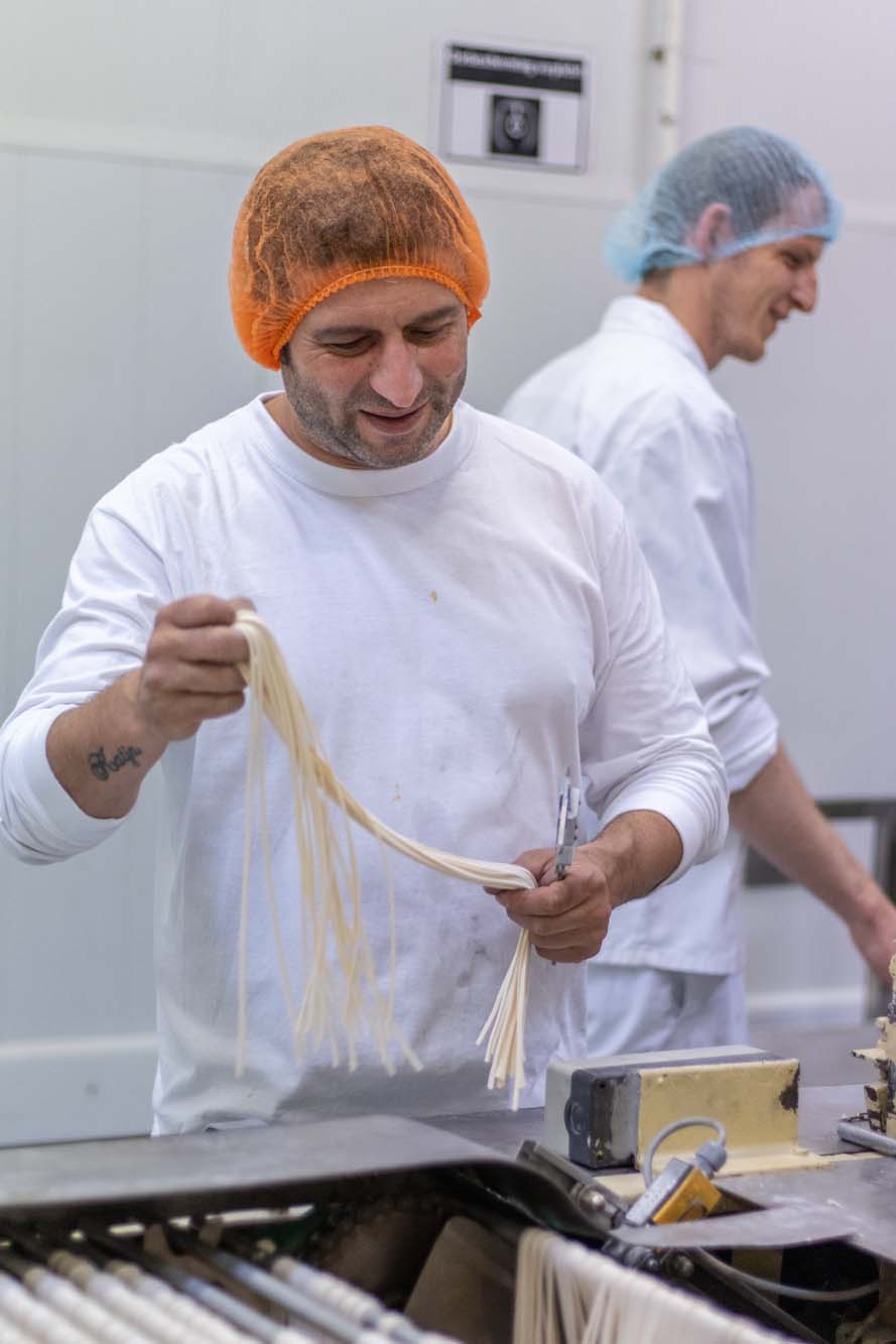 Op de productie voor de droge noedels en de inpakafdeling werken 10 collega's, die verschillende afdelingen beheren. Er is een afdeling noedel productie, maar ook een afdeling die alles verpakt.
